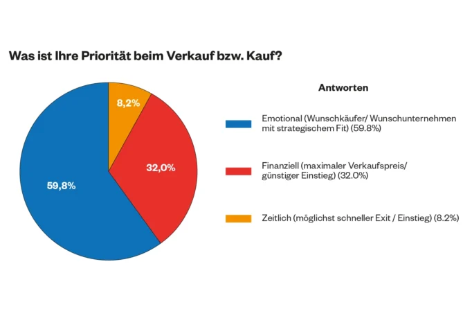Das vielleicht überraschendste Ergebnis der Studie: Fast 60 Prozent der Befragten priorisieren die emotionale Passung gegenüber dem Kaufpreis. Sie wollen ihr Lebenswerk in die richtigen Hände geben – jemand, der die Unternehmenskultur respektiert, Mitarbeiter wertschätzt und das Geschäft weiterführt. Nur 32 Prozent sehen den maximalen Verkaufspreis als oberste Priorität.
